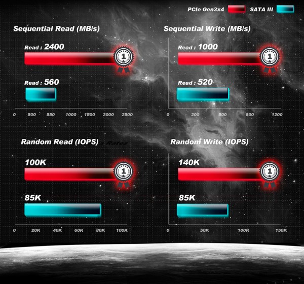 The XPG SX8000 connects to desktop and notebook PCs via low profile M.2 2280 and channels data through PCI Express 3.0 x4 (four lane). The low latency and big bandwidth of PCIe enable up to 2.4GB/s read and 1GB/s write - four times the read and twice the write performance of average SATA 6Gb/s SSDs. Random 4K IOPS figures are 100K read and 140K write, also significantly more than SATA-based drives.The SX8000 features full NVMe 1.2 compatibility, powering a large performance boost that means users notice gains in real world scenarios, especially loading times within games that require heavy asset streaming and in professional applications such as graphics and audio rendering.