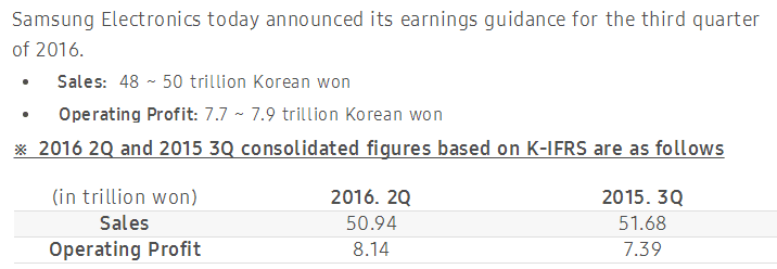 Samsung Electronics today announced its earnings guidance for the third quarter of 2016.