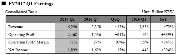 The Company’s consolidated first quarter revenue totaled 6.29 trillion won while operating profit amounted to 2.47 trillion won and net income was 1.9 trillion won. Operating margin for the quarter was 39% and net margin was 30%.