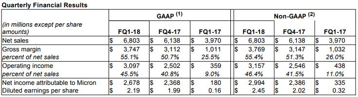 Micron Technology, Inc.,today announced results of operations for its first quarter of fiscal 2018, which ended November 30, 2017.