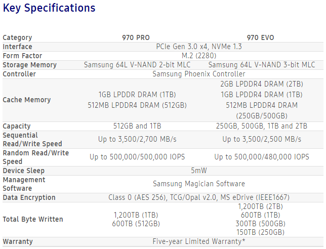The 970 PRO and EVO also provide greater system design flexibility for the high-performance computing systems. Offering a variety of high capacity options in a compact M.2 form factor – including the single-sided 2TB EVO model – the 970 series enables convenient storage expansion across a wide range of computing devices.