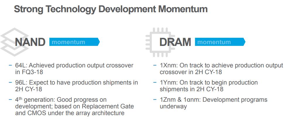 The second important note from the presentation is that Micron expects 1X nm (18 nm) DRAM production to exceed that of previous generations before the end of this year. Their next-generation 1Y nm (15/16 nm) DRAM is on track to begin production shipments in the second half of 2018, too. As they noted in a previous event, their product and process roadmap for DRAM 1z looks solid and 1-alpha development programs already under way.