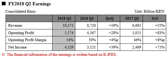 SK Hynix Inc. today announced financial results for its second quarter 2018 ended June 30, 2018. The consolidated second quarter revenue was 10.37 trillion won while the operating profit amounted to 5.57 trillion won and the net income 4.33 trillion won. As a result, the Company has set all-time high figures in quarterly revenue, operating profit and net income.