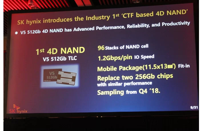 SK Hynix believes that the periphery block can be stacked along with the CTF stack, with microscopic vias wiring up the stack along the periphery, reducing the footprint of each cell stack. 4D stacking will also allow for greater number of CTF stacks per cell. Just to be clear, we're talking about stacks of cell and not stacks of NAND flash dies. The V5 cell-stack in SK Hynix's design entails 4 cells and periphery blocks sandwiched. The first implementation of this technology is a 96-layer 4D NAND flash chip with 512 Gb of capacity and TLC (3 bits per cell) density, although the technology is ready for QLC cells. This 512 Gb chip will begin sampling by the end of 2018, and the company is already working on a 1 Tb chip for 2019.