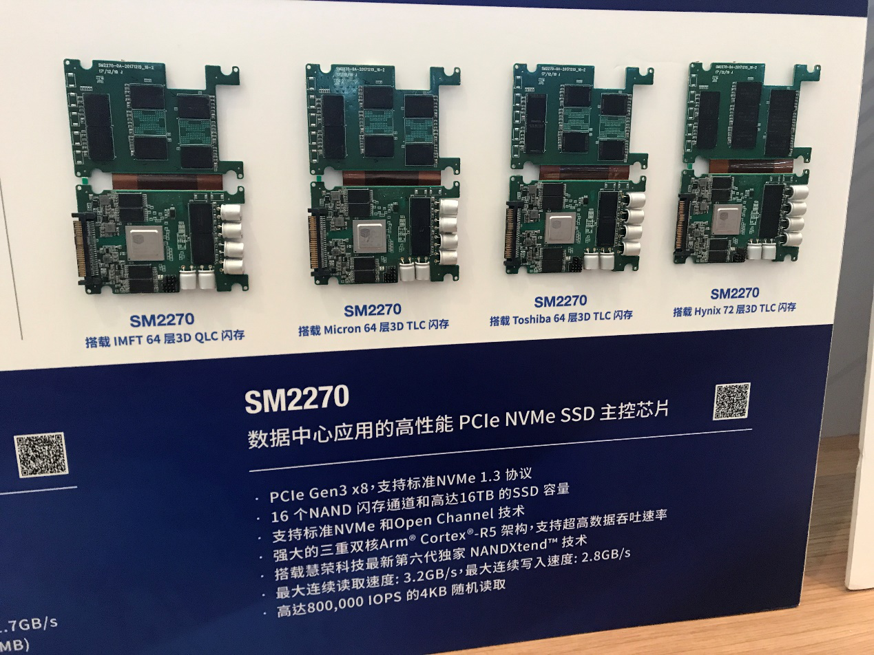 Introduced for enterprise and datacenters applications, the SM2270 supports PCIe Gen3 x8, 16 flash memory channels and 64/96-layers 3D NAND, and the maximum capacity up to 16TB. The sequential read/write, random read and sustained random write are 3.2GB/s, 2.8GB/s, 800K IOPS and 200K IOPS respectively, which fully satisfies the demands of enterprises and datacenter SSD. Thanks to the excellent performance, while SM2270 is launched, the controller is adopted by many enterprise and datacenters used in their latest products.
