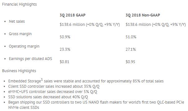 Silicon Motion Technology Corporation (“Silicon Motion” or the “Company”) today announced its financial results for the quarter ended September 30, 2018. For the third quarter, net sales increased sequentially to $138.6 million from $138.1 million in the second quarter 2018. Net income (GAAP) decreased to $29.2 million or $0.81 per diluted ADS (GAAP) from a net income (GAAP) of $30.7 million or $0.85 per diluted ADS (GAAP) in the second quarter 2018.