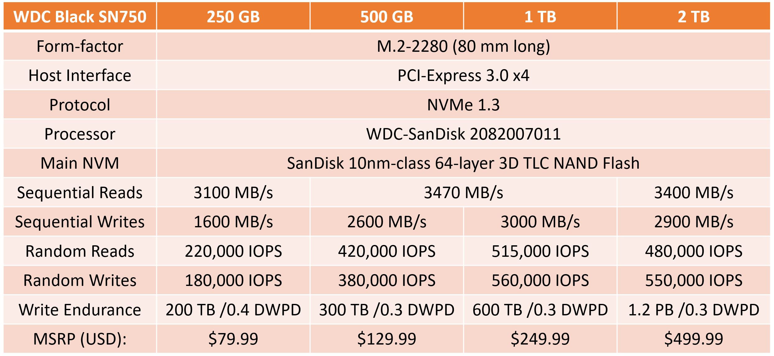 Available in capacities of 250 GB for $80, 500 GB for $130, 1 TB for $250, and 2 TB for $500, the WD Black SN750 offers sequential transfer rates of up to 3470 MB/s reads on the 500 GB and 1 TB models. The 250 GB model reads at up to 3100 MB/s, and the 2 TB model up to 3400 MB/s. Sequential write speeds, too, are improved across the board, with up to 3000 MB/s for the 1 TB model, up to 2900 MB/s for the 2 TB model, up to 2600 MB/s for the 500 GB model, and up to 1600 MB/s for the 250 GB model. 4K random-access numbers can be as high as 515,000 IOPS reads. All models are backed by 5-year product warranties.