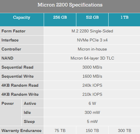 Available in capacities of 256 GB, 512 GB, and 1 TB, the Micron 2200 is rated to offer sequential transfer rates of up to 3000 MB/s reads, with up to 1600 MB/s writes, up to 240,000 IOPS 4K random reads, and up to 210,000 IOPS 4K random writes, with an endurance rating of 75 TB, 150 TB, and 300 TB, for the 256 GB, 512 GB, and 1 TB variants, respectively. Micron-exclusive features also make their way, such as native power-loss data-protection, and TCG Opal SED. The company hasn't revealed pricing or availability for these drives.