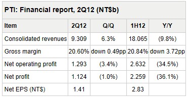 Memory IC packaging and testing service provider Powertech Technology (PTI) has reported net EPS of NT$2.83 for the first half of 2012.