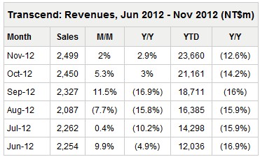 Transcend's November revenues increased by 2.03% on month and by 2.91% on year, while its January-November revenues of NT$23.660 billion slipped on year by 12.63%. Of November revenues, 54.6% came from consumer NAND flash memory products and 12.4% from standard DRAM products.