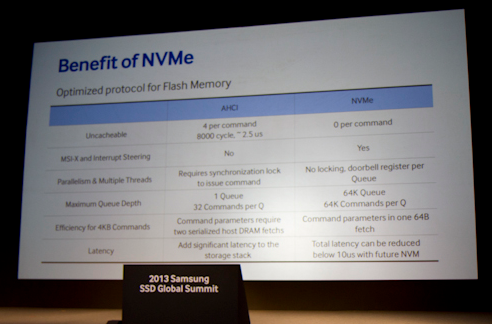 The above slide has a lot of low-level detail describing NVMe, but there are two important points. First, AHCI adds an enormous amount of overhead and latency to commands and transfers, which simply aren't required when you're working with flash memory. The second one involves queuing. The AHCI protocol can only handle one queue with up to 32 commands. Even the fastest 15,000 RPM disk drives have access times in 5 ms range. Hammered by purely random accesses, a single queue with 32 commands is more than enough.