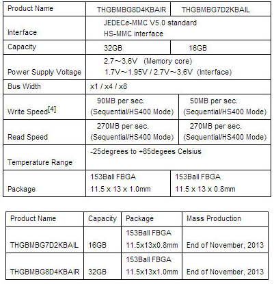 The new products are sealed in a small FBGA package measuring just 11.5 x 13mm, and have a signal layout compliant with the JEDECe-MMC V5.0.