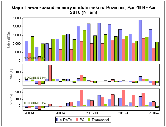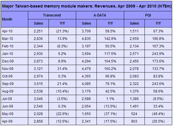 Meanwhile, Power Quotient International (PQI) saw consolidated revenues for April 2010 slide 41% sequentially to NT$1.71 billion, mainly due to seasonal factors, according to the company. Sales ratio between NAND flash products and DRAM modules was 60:40 for the month.
