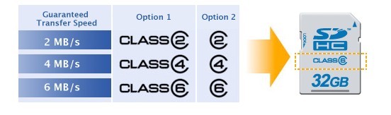 These new speeds are available in a new specification defining the minimum data transfer speeds for both SD/SDHC memory cards and SD/SDHC host products. This enhancement is easily recognized by three levels of Speed Class, class 2, 4 and 6. Speed Class 2 guarantees a minimum transfer speed of 2 mega bytes per second (MB/s), Speed Class 4 guarantees a minimum transfer speed of 4 MB/s and Speed Class 6 guarantees a minimum transfer speed of 6 MB/s.