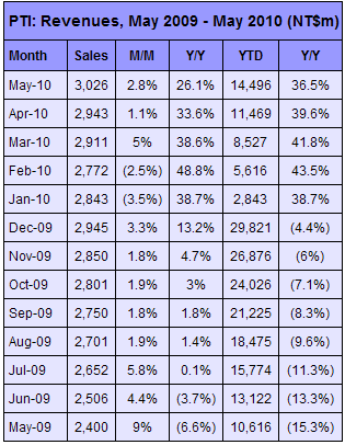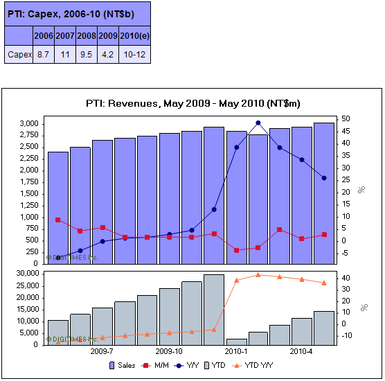 PTI's revenues for June are likely to top NT$3.1 billion (US$96.5 million), hitting a record for the second consecutive month, according to the watchers. Revenues for the third and fourth quarters are expected to show single-digit growth sequentially amid sustained high utilization.