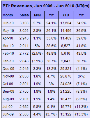 PTI saw consolidated figures total NT$9.285 billion in the second quarter, compared to NT$8.65 billion posted in the first quarter. The 7% sales growth was in line with the company's guidance.