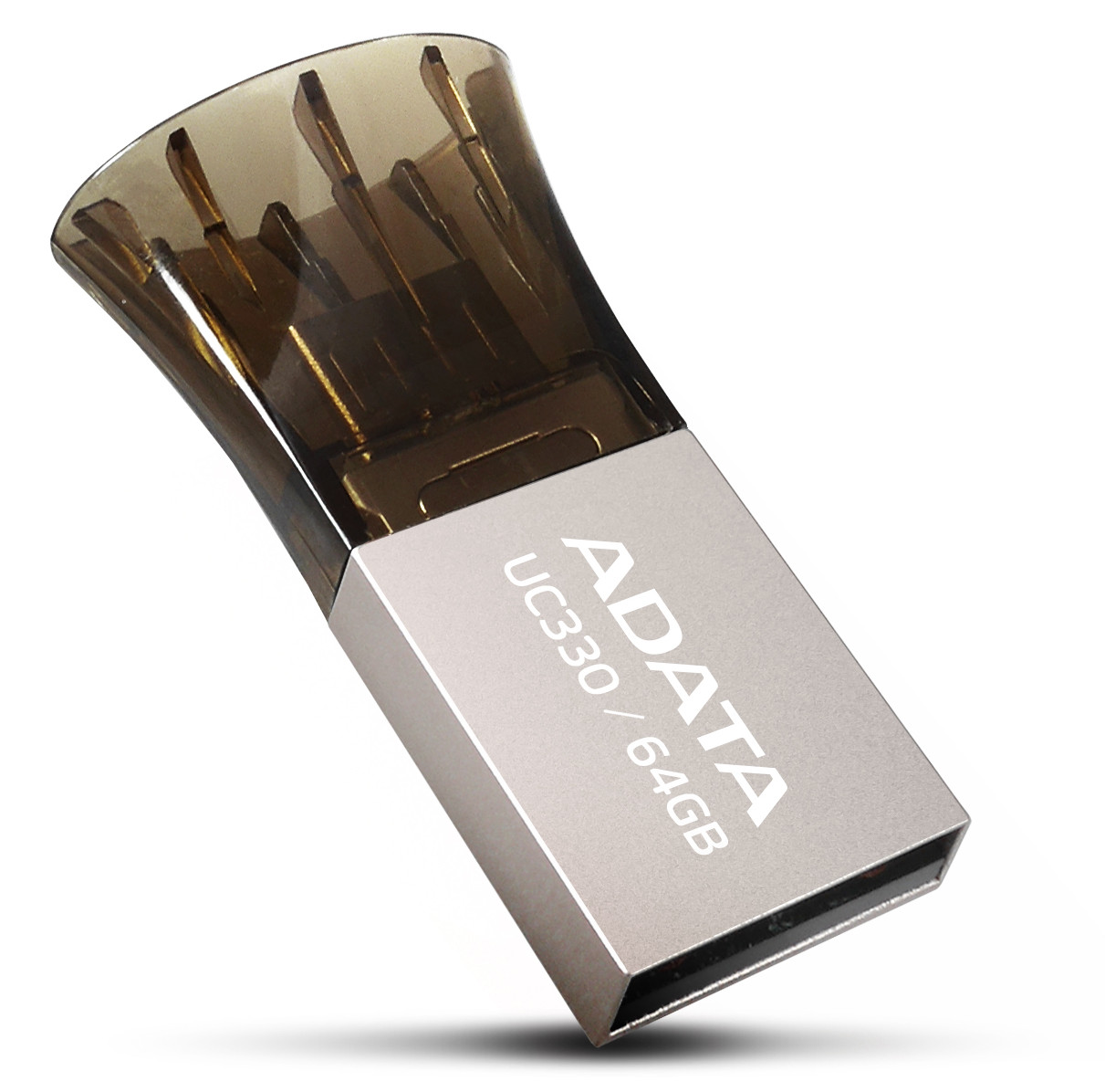 Flawlessly crafted of zinc alloy with a silver finish, ADATA's Choice UC330 Dual USB Flash Drive weighs only 3.6 grams and comes with a black end cap fitted with a strap hole so you can easily carry the flash drive on a lanyard, keychain or neck strap. As you use the rocket-shaped UC330, its cap fits on either side of its dual-headed USB. When not in use, stand it up on its end for easy storage on your desktop like a rocket awaiting lift-off. Manufactured with a special chip-on-board (COB) process, resulting in high water and impact resistance, your UC330 flash drive is engineered for utmost quality and reliability.