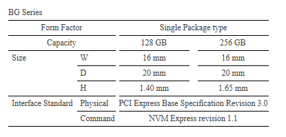 The single package type SSDs of the new series weigh below 1 g, reducing weight by approximately 98%, compared to 2.5-inch types widely used in PCs. It also reduces storage space by more than 95%. It can contribute to light-weight mobile PCs and also to longer battery life by increasing available space for battery packs.
