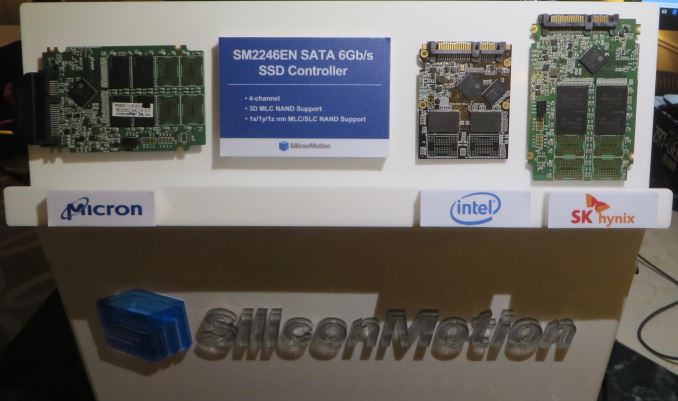 The most important development for the SSD market in 2016 will almost certainly be the availability of 3D NAND from companies other than Samsung (who's been shipping 3D NAND since 2014 and will be rolling out their third generation of it this year). Silicon Motion has updated their firmware for the SM2246EN controller to support 3D MLC NAND, and they showed off drives using 3D NAND flash sourced from Intel, Micron, and Hynix. This demonstrates that Silicon Motion is ready for the transition to 3D NAND and that we can expect drives to be hitting the shelves as soon as the flash itself is available in bulk on the open market. It's also nice to have independent confirmation that both IMFT and Hynix are on track with their 3D NAND development. Conspicuously absent from the lineup was 3D NAND from the Toshiba and SanDisk joint venture. We already expected them to be last to ship 3D NAND due to their fab for it not being scheduled to begin mass production until this year, so it's no surprise if they're keeping things under wraps for a little longer.