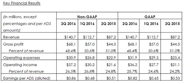 GAAP net income for the second quarter increased to $29.0 million or $0.82 per diluted ADS from a GAAP net income of $23.0 million or $0.65 per diluted ADS in the first quarter.