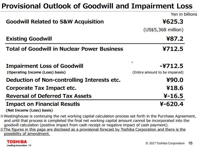 This comes in the wake of recent snags and strategic mistakes for the company, as we've previously reported - such as the $1.2 billion dollar accounting "misstated" earnings, which created difficulties for the company to refinance itself in the Tokyo Stock Exchange, and the gross miscalculation on the amount of debt of the CB&I Stone and Webster company that Toshiba acquired so as to facilitate its U.S.-based Westinghouse Electric nuclear plant subsidiary investment. This "miscalculation", where Toshiba considered the "goodwill" booking charges at $87 million and which were recently restated at a roughly-defined "several billion U.S. dollars." now stand at an eye-watering $6.3 billion.