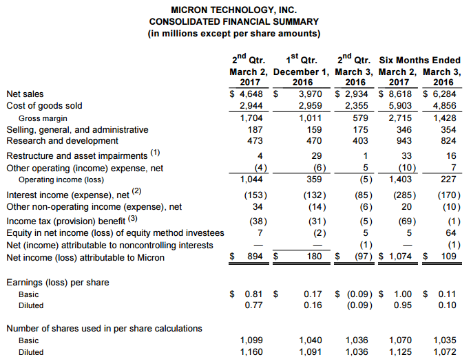 Non-GAAP Income and Per Share Data — On a non-GAAP(2) basis, gross margin was 38.5 percent and net income attributable to Micron shareholders was $1.03 billion, or $0.90 per diluted share, for the second quarter of fiscal 2017 compared to gross margin of 26.0 percent and net income of $335 million, or $0.32 per diluted share, for the first quarter of fiscal 2017 and gross margin of 20.4 percent and net income of $12 million, or $0.01 per diluted share, for the second quarter of fiscal 2016. For a reconciliation of GAAP to non-GAAP results, see the accompanying financial tables and footnotes.