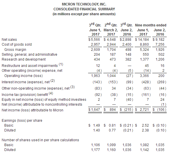 Non-GAAP Income and Per Share Data — On a non-GAAP basis, gross margin was 48.0 percent and net income attributable to Micron shareholders was $1.90 billion, or $1.62 per diluted share, for the third quarter of fiscal 2017 compared to gross margin of 38.5 percent and net income of $1.03 billion, or $0.90 per diluted share, for the second quarter of fiscal 2017 and gross margin of 18.1 percent and a net loss of ($29) million, or ($0.03) per diluted share, for the third quarter of fiscal 2016. For a reconciliation of GAAP to non-GAAP results, see the accompanying financial tables and footnotes.