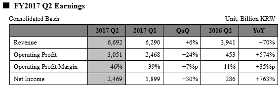 The consolidated second quarter revenue was 6.69 trillion won while the operating profit amounted to 3.05 trillion won and the net income totaled 2.47 trillion won. During the second quarter, favorable market conditions continued to raise memory semiconductor prices. The Company benefited by dealing well with the market situation, elevating its revenue and operating profit by 6% and 24% each compared to the previous quarter.