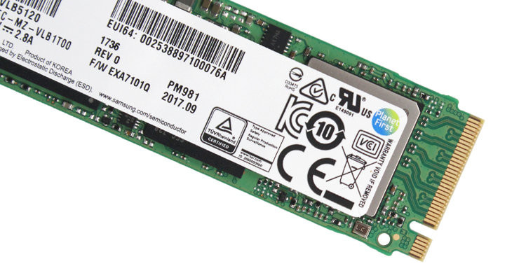 The next-gen Samsung NVMe drives carry the PM981 code-name - where "PM" stands for TLC NAND (in this case, based on 64-layer 3-bit per cell V-NAND chips), "9" stands for Samsung's highest performing solutions, and "81" stands for the part number - two tiers ahead of Samsung's 960 series. It's expected that there will be a 970 part, since Samsung seems to be steering away from the "EVO" and "PRO" monikers to differentiate products according to performance - a straight numeral is expected to be the norm going forward. For now, the parts that have surfaced carry 512 GB and 1 TB of memory. These will make use of Samsung's Polaris V2 controller (with a metal heatsink over it to aid in cooling), and deliver 3,000 MB/s and 3,200 MB/s sequential read speeds (for the 512 GB and 1 TB versions respectively) and 1,800 MB/s and 2,400 MB/s sequential write, respectively. The models surfaced from a Vietnamese retailer, which has them going for $233 and $439 - which doesn't mean this will be the final consumer retail price, but seems reasonable for the technology and performance tier of these NVMe SSD solutions.