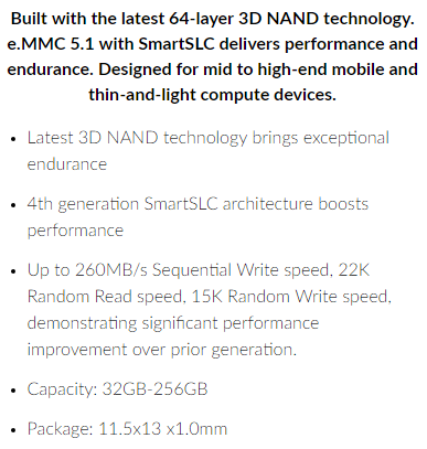 The iNAND 7550 EFD enables mobile manufacturers to create cost-effective smartphones and computing devices that feature ample storage to meet the needs of increasing consumer content while providing fast and engaging application experiences. Built on the e.MMC 5.1 specification, it is the company’s highest performing iNAND EFD based on the widely used e.MMC interfaces to date, and delivers sequential write performance of up 260 MB/s and random read/write performance of 20K IOPS and 15K IOPS respectively3. This enables the iNAND 7550 to enhance boot-up and application launch times.