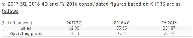 Overall the company estimated full-year 2017 consolidated sales of approximately 239.60 trillion Korean won and consolidated operating profit of approximately 53.60 trillion Korean won.