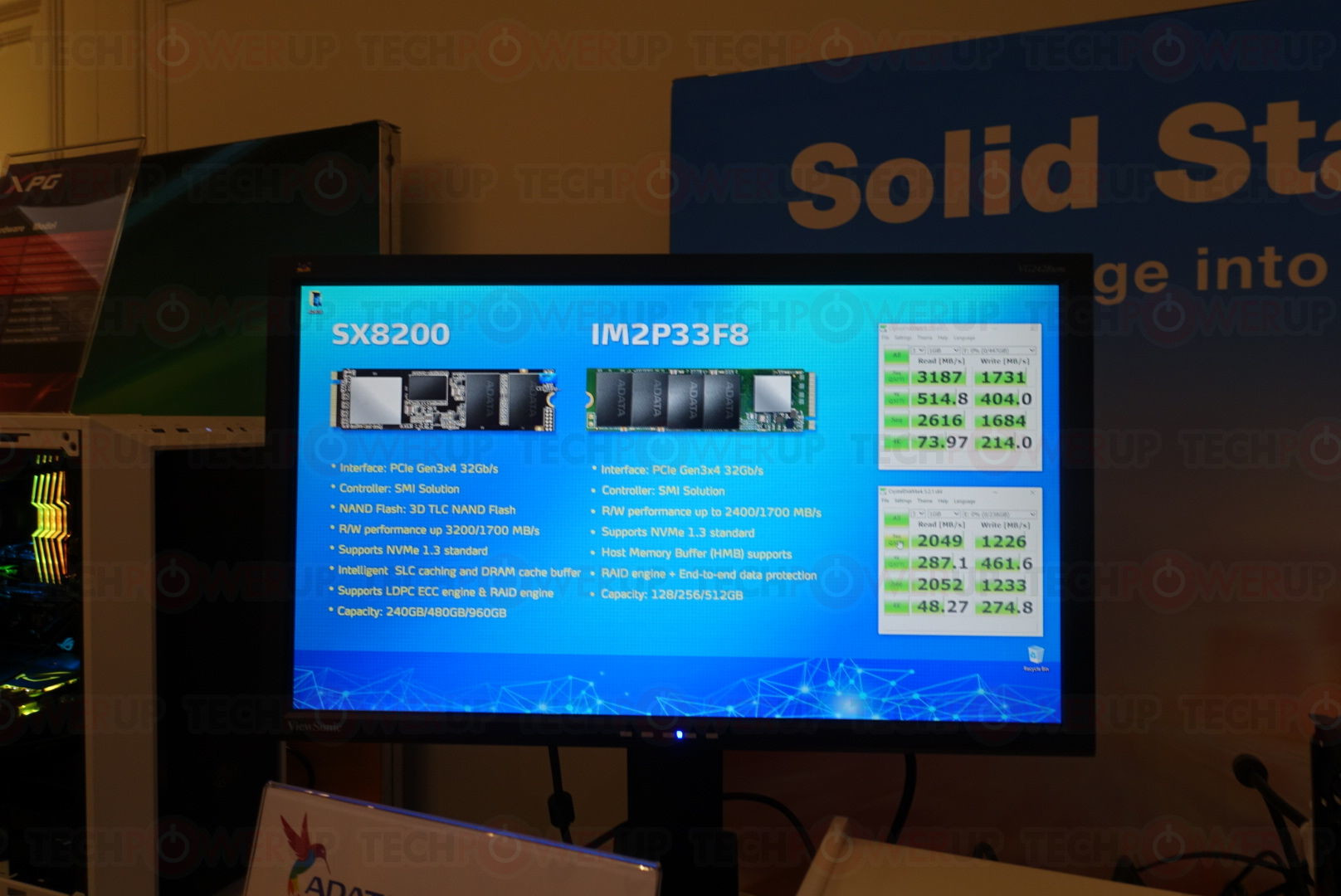ADATA showed off its latest M.2 NVMe SSDs that support the latest NVMe 1.3 specification, and are based on some of the newer generation controllers, beginning with the XPG SX8200. This drive combines Silicon Motion SM2262 controller with 3D TLC NAND flash memory, and comes in capacities of 240 GB, 480 GB, and 960 GB. The drive offers sequential transfer rates of up to 3200 MB/s reads, with up to 1700 MB/s writes; and features SLC caching, an LPDC ECC engine, and an internal RAID engine.