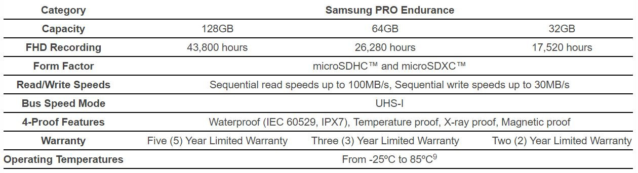The Samsung PRO Endurance offers 25 times higher endurance than previous speed-focused cards. It also comes with an industry-leading limited warranty up to five years, and sets a new standard for capacity with its 128GB of storage.