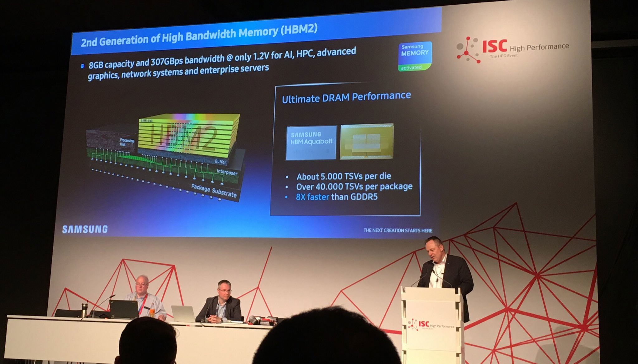 Samsung has reportedly doubled its manufacturing output of HBM2 (high-bandwidth memory 2) stacks. Despite this, the company may still fall short of the demand for HBM2, according to HPC expert Glenn K Lockwood, Tweeting from the ISC 2018, the annual HPC industry event held between 24th to 28th June in Frankfurt, where Samsung was talking about its 2nd generation "Aquabolt" HBM2 memory, which is up to 8 times faster than GDDR5, with up to 307 GB/s bandwidth from a single stack.