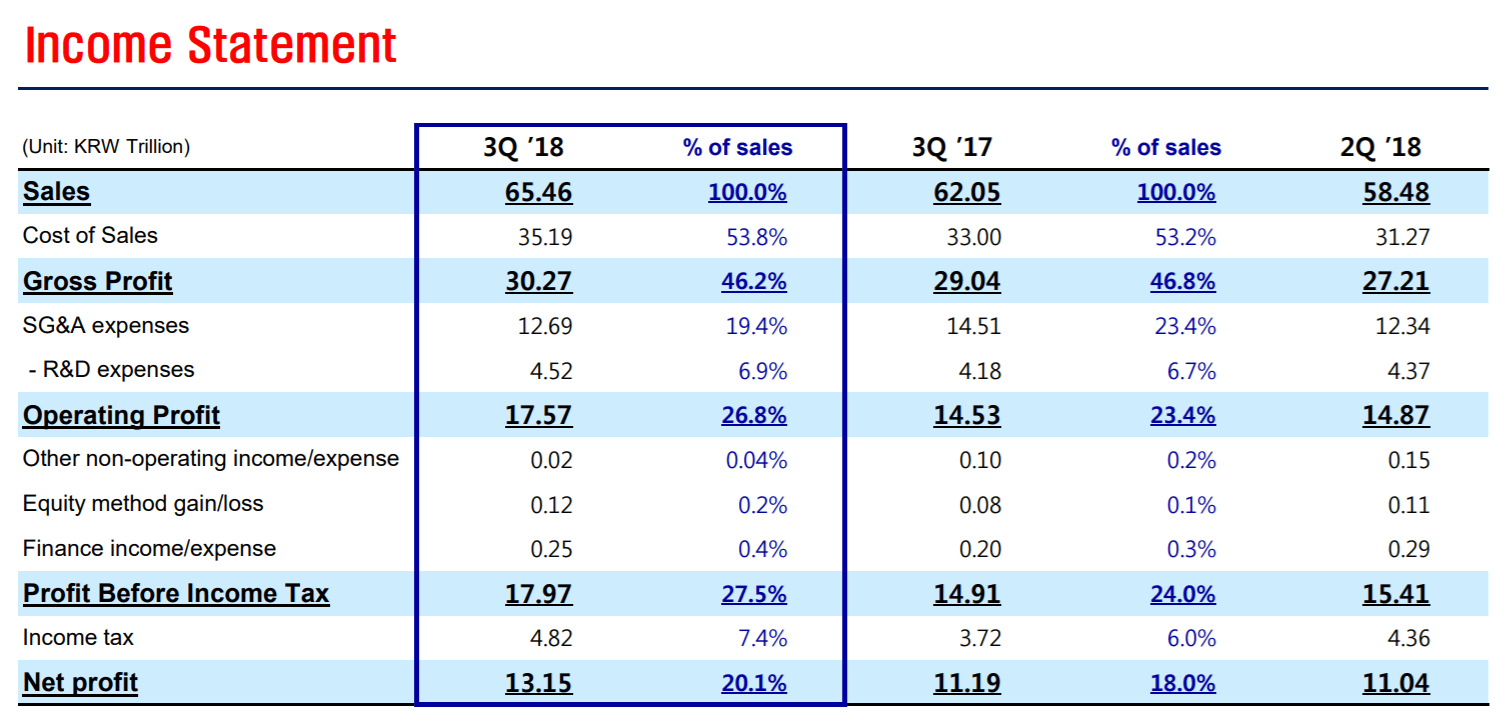 Samsung Electronics reported financial results for the third quarter ended Sept. 30, 2018. The Company posted KRW 65.46 trillion in consolidated quarterly revenue, up 5.5 percent from a year earlier, and KRW 17.57 trillion in quarterly operating profit, up 20.9 percent.