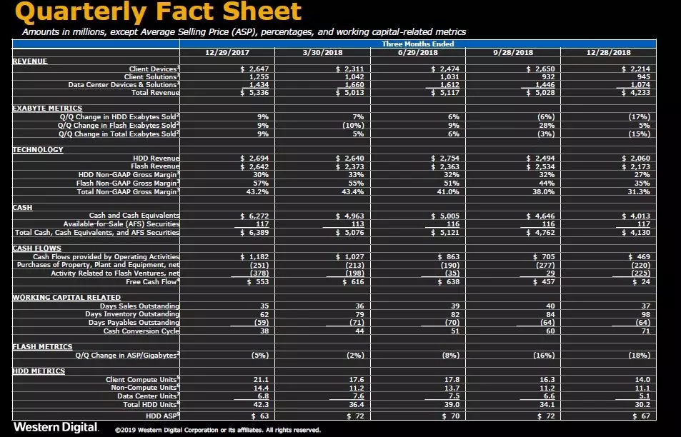 "Despite a softening business environment, our fiscal second quarter results were generally within our guidance ranges," said Steve Milligan, chief executive officer, Western Digital. "We are taking actions to better align our cost and expense structure to near-term business conditions while continuing to deliver innovative solutions to drive our future success. We enter calendar 2019 with the strongest product portfolio in our history and confidence in our ability to capitalize on the long-term opportunities associated with data growth."