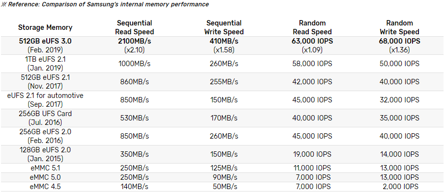 Samsung produced the industry-first UFS interface with eUFS 2.0 in January, 2015, which was 1.4 times faster than the mobile memory standard at that time, referred to as the embedded multi-media card (eMMC) 5.1. In just four years, the company’s newest eUFS 3.0 matches the performance of today’s ultra-slim notebooks.