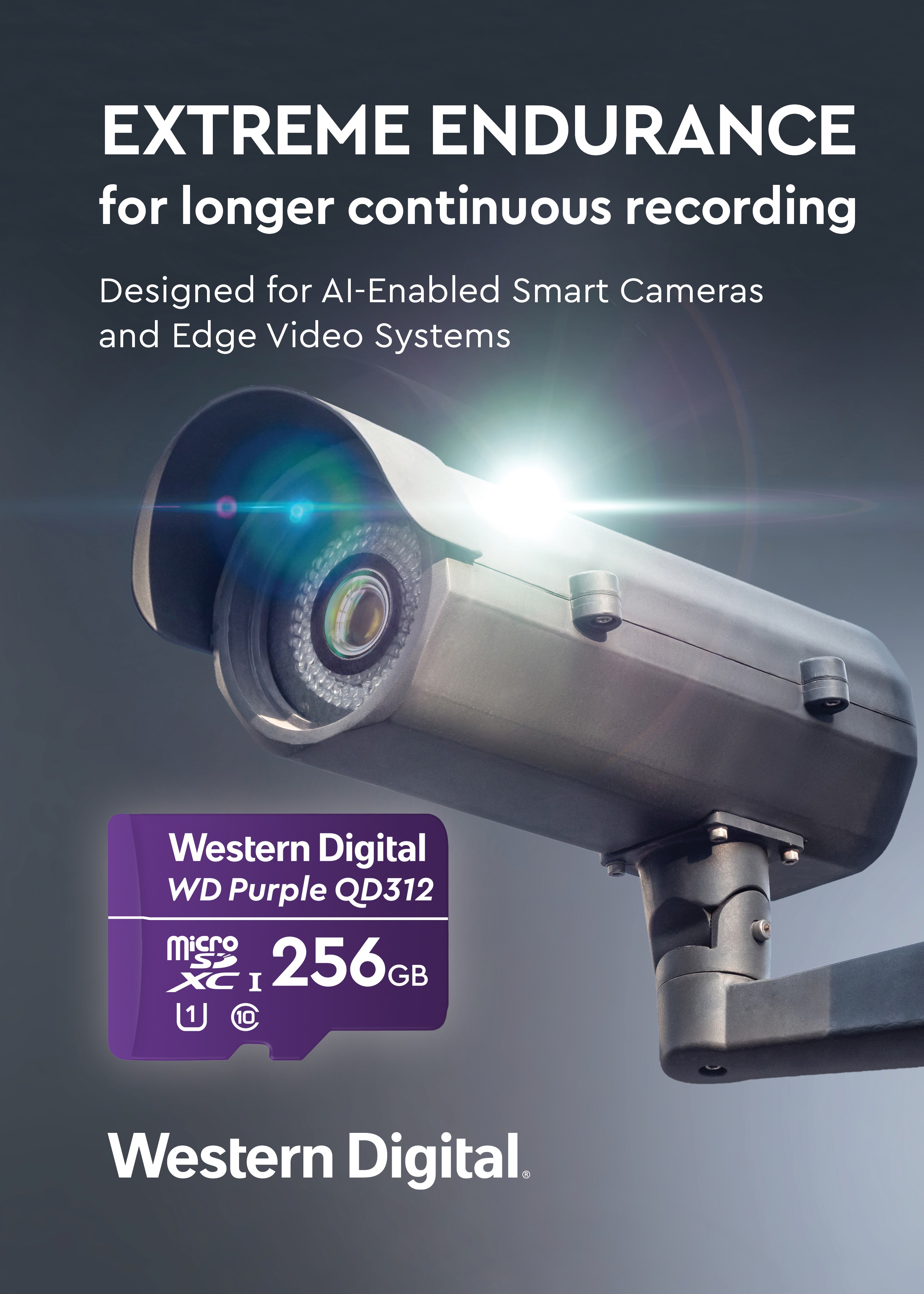 Western Digital Corp. today unveiled the new Western Digital® WD Purple® SC QD312 Extreme Endurance microSD™ card for designers and manufacturers of AI-enabled security cameras, smart video surveillance and advanced edge devices that capture and store video at higher bit rates than mainstream cameras.