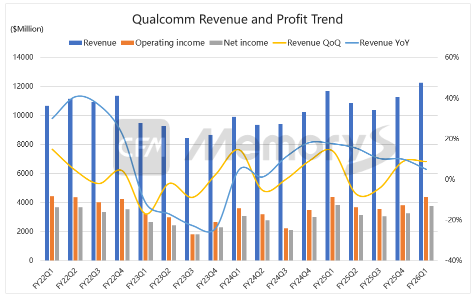 Qualcomm announced its financial results for the first quarter of fiscal year 2026 (ended December 28, 2025). The company reported revenues of $12.25 billion, with a year-on-year increase of 5%. Non-GAAP net income was $3.78 billion, with a year-on-year decrease of 1%. Non-GAAP diluted earnings per share is $3.50.
