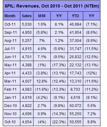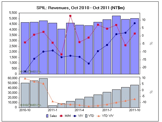 SPIL accumulated NT$56.13 billion in revenues from January through November, showing a 4.1% decline compared to the same period of 2010.
