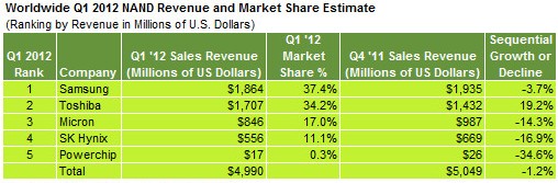 Samsung maintained its lead with a 37 percent share despite lower revenue in the first quarter of $1.86 billion, down sequentially from $1.94 billion. U.S.-based Micron Technology Inc., SK Hynix Semiconductor Inc. of South Korea and Powerchip of Taiwan rounded out the rest of the tightly held NAND market. Overall first-quarter NAND flash sales amounted to $4.99 billion, down 1 percent from $5.05 billion in the fourth quarter last year.