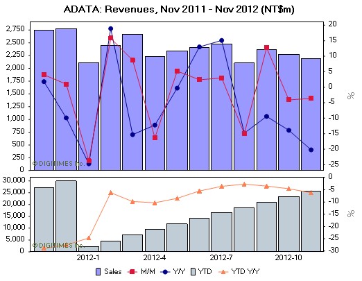 Adata's cumulative 2012 revenues through November totaled NT$25.46 billion, down 6.2% on year. The firm's sales ratio between DRAM modules and other products was 40:60 during the 11-month period.