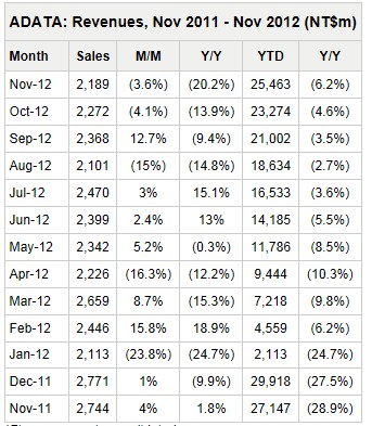 Memory module maker Adata Technology has announced that revenues for November 2012 decreased 3.6% sequentially and 20.2% from a year ago to NT$2.19 billion (US$75.3 million).