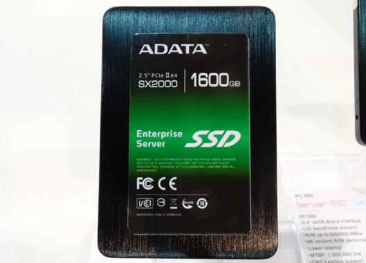 ADATA showed off a new high-performance server-grade SSD, the SX2000. Built in the 2.5-inch form-factor, this drive features a PCI-Express 2.0 x4 interface (a cable runs to a PCIe riser card). It is driven by an LSI-SandForce SF-8639 controller, which is a single-chip solution that connects to the host over PCI-Express, and appears to the operating system as ATA AHCI controller, with one drive connected to it. The chip features nearly more than double the ONFI channels as an SF-2281, which reflects on the drive's advertise performance numbers: up to 1,800 MB/s reads with up to 1,800 MB/s writes; up to 200,000 IOPS 4K random reads. The controller supports all modern enterprise SSD features, including TRIM, DEVSLP support, and SMART. It ships in 100 GB, 200 GB, 400 GB, 800 GB, and 1,600 GB variants. The latter was up on display.