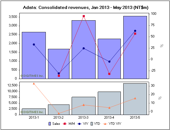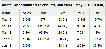 Adata has announced May consolidated revenues of NT$3.55 billion (US$119 million). Sales for the first five months of 2013 amounted to NT$13.45 billion, rising 15.7% from a year ago.