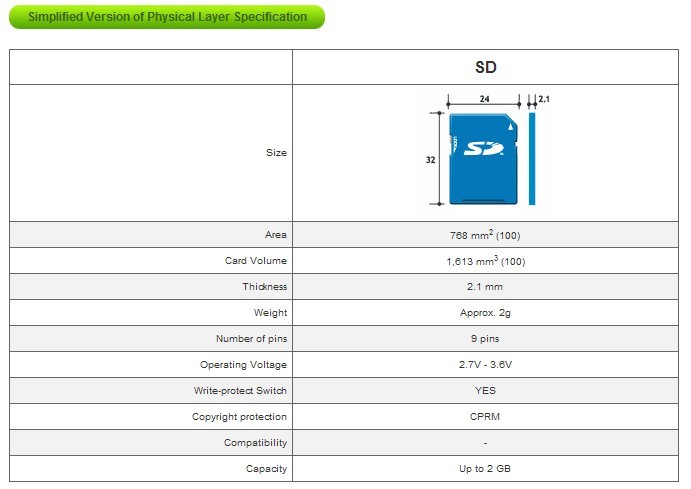The SD card measures a mere 24mm x 32mm x 2.1mm approximately the size of a postage stamp. The slim, compact design promotes easy handling, an important factor for a "bridge media" that can be moved between different products. Using decoder software, an SD compatible device can play music, video clips and more without a drive mechanism like those in CD and DVD players. This allows the equipment to be more compact and gives product designers new creative freedom. Reliability is also improved through the elimination of skipping on music and video files.