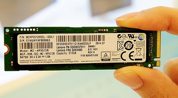 Samsung's SM951 comes in the M.2 form factor (80mm x 22mm), which is only about one seventh the size of a 2.5 inch SSD. Also, it weighs approximately six grams. The drive's compactness is well suited for most notebook PC designs, freeing up space for other components including the battery. The SM951 lineup consists of 512, 256 and 128GB SSDs.
