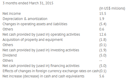 Net income (non-GAAP) was US$16.6 million for the first quarter, a decrease from US$18.5 million in the fourth quarter. Diluted earnings per ADS (non-GAAP) were US$0.48 per ADS in the first quarter, a decreased from US$0.53 per ADS in the fourth quarter of 2014.