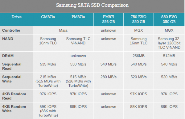 These drives would be replacing Samsung's exisitng product line such as the PM871, which we have limited information about (given slow writes, it is logical to assume that it uses TLC NAND, but that is not something confirmed by Samsung). Meanwhile in the retail channel Samsung sells the inexpensive 850 EVO and 750 EVO SSDs. These SSDs are based on the company’s MGX controller, coupled with the company's second-gen 32-layer TLC V-NAND or 16 nm planar TLC, respectively. The aforementioned drives offer performance levels very similar to those of the forthcoming CM871a and PM871a, which may indicate that Samsung’s new Maia platform focuses mostly on cost efficiency, endurance and predictable performance, but not on maximum sequential read or random IOPS numbers (especially given limitations of SATA). Nonetheless, the development of Maia shows that SATA is still an important part of the market for Samsung as lower-end PCs continue to rely on it.