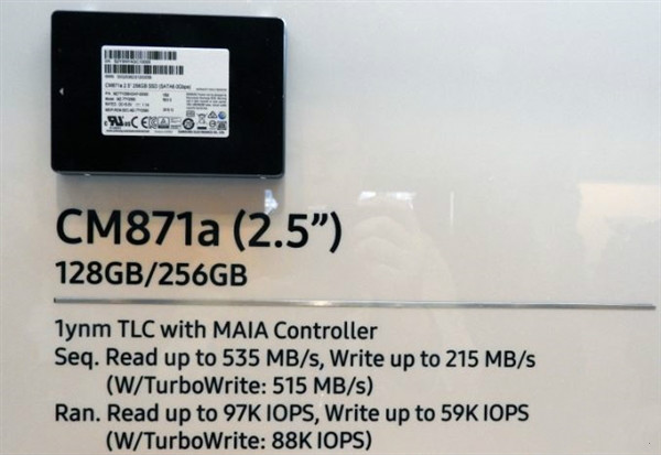 The new Samsung CM871a OEM SSD based on the Maia controller will feature Samsung’s 16nm TLC NAND, which indicates that the company has no plans to drop production of planar NAND flash memory for consumer SSDs any time soon. The drive is rated for maximum sequential read speed of up to 535 MB/s as well as sequential write speed of up to 215 MB/s in default mode or up to 515 MB/s with TurboWrite technology active. Like many modern TLC NAND-based SSDs, the CM871a uses part of the non-volatile memory in SLC mode for rapid caching. The SSDs can perform up to 97K random read IOPS as well as up to 59K random write IOPS (or 88K IOPS with TurboWrite technology). Samsung will offer its CM871a in 128 GB and 256 GB configurations, which indicates that the family was designed for the low end of the market.